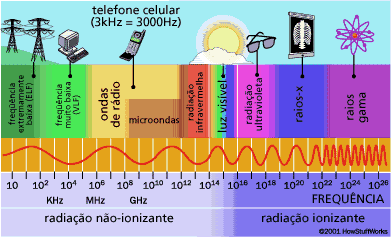 Os raios infravermelhos, ultravioletas e a luz emitida pelo sol são exemplos de ondas eletromagnéticas. Quando a frequência das ondas é muito alta, as radiações são chamadas ionizantes, como é o caso dos raios X, ou raios gama, e seus efeitos adversos já são bem conhecidos. Acontece que as radiações dos celulares possuem frequências bem menores, mais próximas das microondas, e são classificadas como não ionizantes. Veja na figura, o espectro eletromagnético mostrando alguns tipos de ondas e suas frequências.