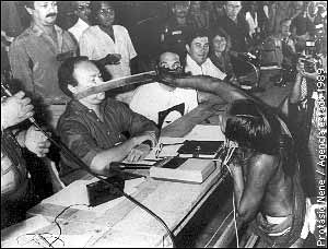 | A índia Tuíra, colocando o facão no rosto do diretor da Eletronorte, Muniz Lopes. |