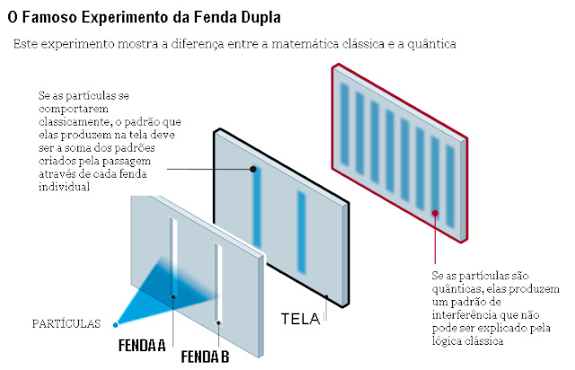 Uma das experiências que ajuda a distinguir a física quântica da física clássica é a Experiência da Fenda Dupla. Suponha que você pulverize algumas partículas em direção a uma placa com duas fendas, e estude os resultados projetados em uma tela. (veja o diagrama que eu traduzi, e que foi fornecido neste link no artigo original da New Scientist).